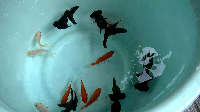 定番の赤出目金、黒出目金や更紗琉金、丹頂、東錦
